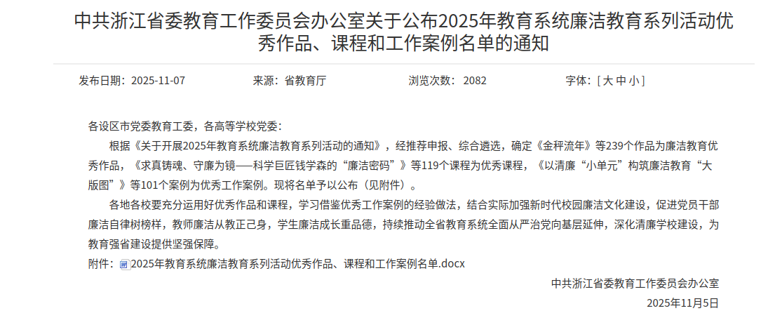 近日,在2025年浙江省教育系统廉洁教育系列活动评选中,我校人文旅游学院辅导员金亚萍撰写的征文《商城廉韵:清风过处是莲灯》荣获优秀作品三等奖。该作品以细腻笔触和深邃思考,生动诠释了植根于义乌商贸基因与校园文化中的清廉底色,展现了学院教师崇廉尚洁、以文化人的精神风貌。