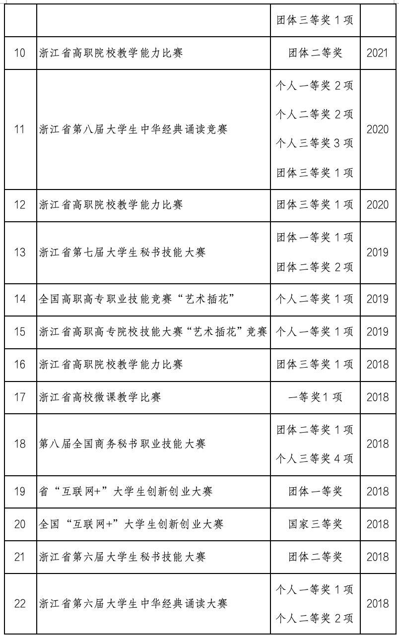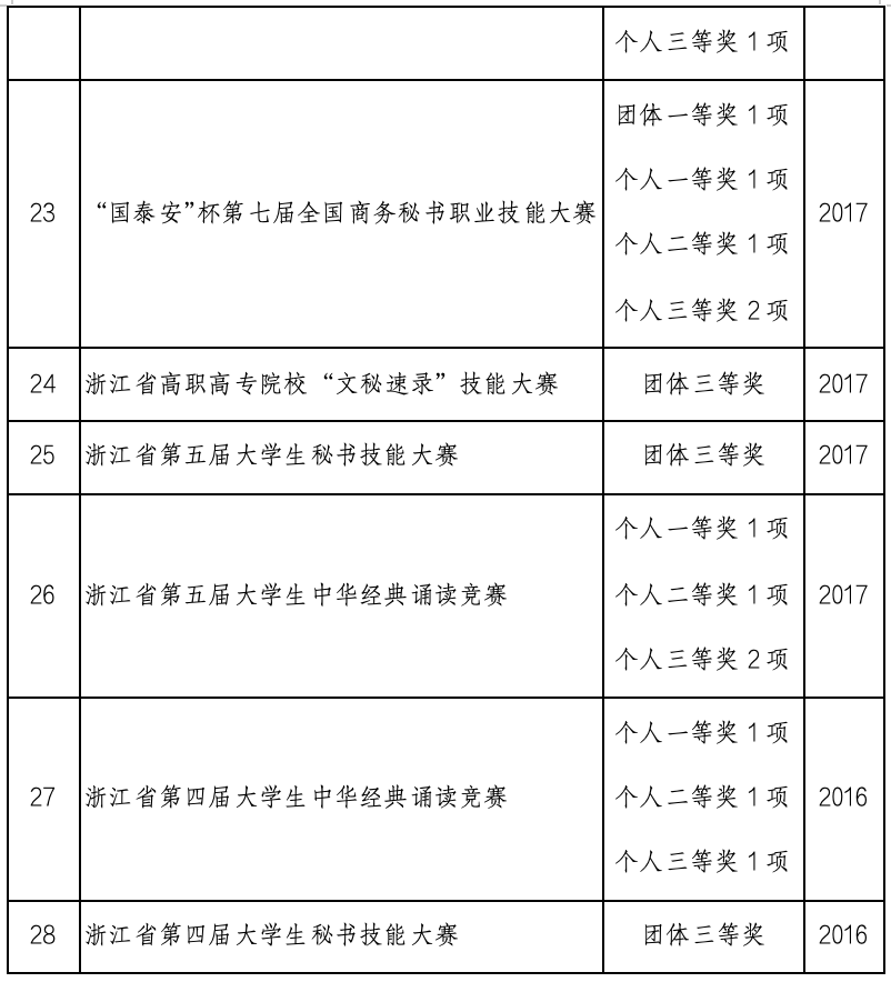 技能大赛是学生展示自我的平台,现代文秘专业以技能大赛为契机,促进教师队伍建设,以技能大赛为载体,促进学生全面发展,提高人才培养质量。2016年至2024年,专业师生积极参加全国和全省技能比赛,屡创佳绩,成绩斐然,获得三等及以上奖项70余项。