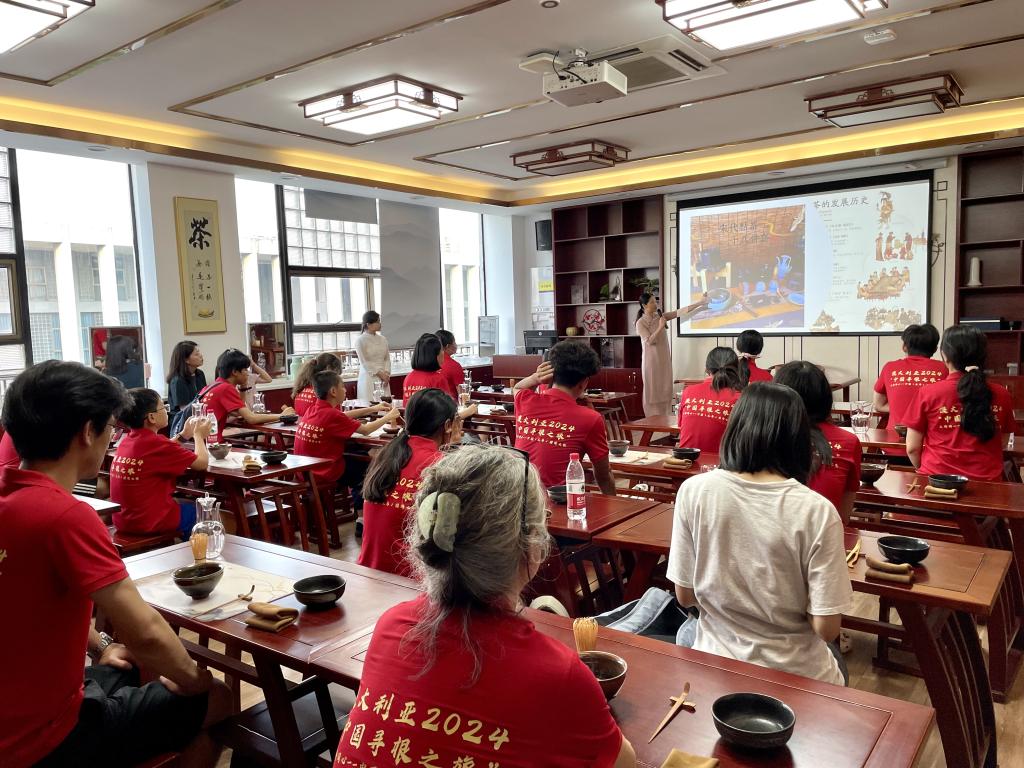 7月6日晚,望道楼408的老师们和志愿者迎来了一群穿着红色T恤衫、背后印有“澳大利亚2024‘中国寻根之旅’义侨同心——中国(义乌)国情之旅”字样的中小学生,他们从遥远的澳大利亚飞来,好奇地走进了茶文化实训室。看到桌子上已经备好的茶具,孩子们两眼放光,迫不及待的拿起来细细观赏,发出“I Love it”的赞叹。