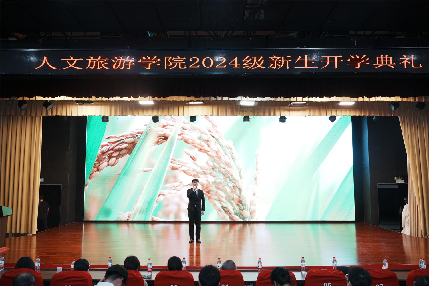 在庄严而隆重的开学典礼上,今年出现了许多别样的面孔,他们正是来自不同国家的24级会展策划与管理专业留学生学历班的新生,与从全国各地汇聚而来的新生们齐聚一堂,共同见证了这场文化盛宴。活动现场,随着悠扬的音乐声响起,一场关于中华经典文化的诵读之旅缓缓展开。华正岩同学作为代表,以他声情并茂的朗诵,将袁隆平先生的《妈妈,稻子熟了》一文深情演绎,仿佛将观众带入了那片金黄的稻田之中,共同感受那份对母亲的思念与对农业事业的执着追求。这一刻,语言成为了连接心灵的桥梁,中华经典的魅力跨越了国界与文化的界限,深深打动了在场的每一个人。
