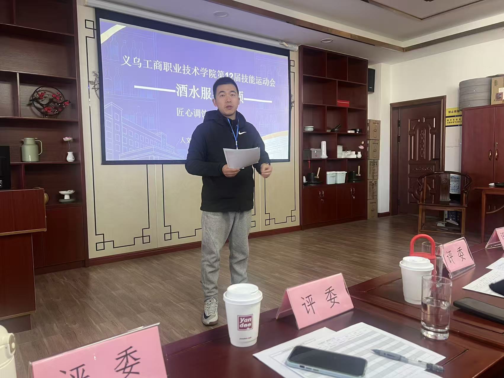 酒水服务决赛由餐饮活动酒水服务情景创意设计,现场解说等环节组成。为考虑本次大赛的公平公正,特邀请了义乌市银都商途餐饮有限公司的餐饮经理余勇君担任评委。比赛过程中,各参赛选手沉着冷静,操作娴熟,赛出了风采、赛出了水平。经过参赛选手紧张激烈的角逐,分别产生了赛项的一、二、三等奖。