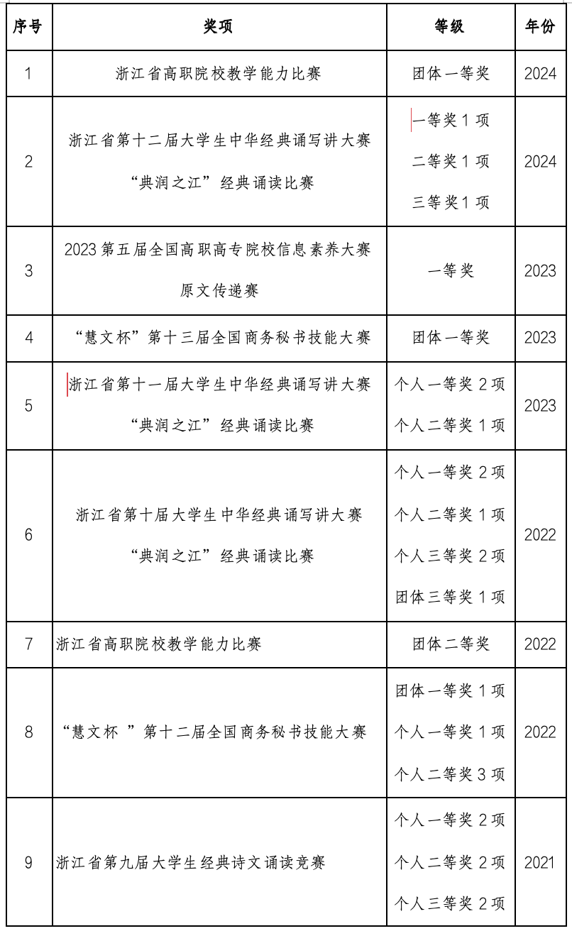 现代文秘专业共有专任教师9名,研究生比例近90%(其中博士1人),高级职称以上的教师7名。所有教师均具有企业实践经历,双师型比例达到100%。教学团队主持省部级以上教改科研项目4项,荣获浙江省微课比赛一等奖,浙江省高职院校教学能力比赛一等奖1项,二等奖3项。选聘实践经验丰富的行业专家、一线技术员等10余人任兼任教师,承担专业建设指导、课堂教学和实习实训指导等任务。