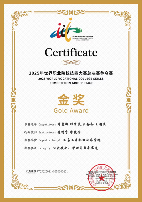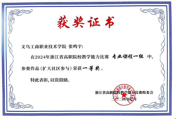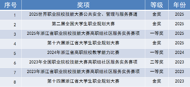 陈璟熠,2025届毕业生,专升本在读,在校期间获2025年第二届全国大学生职业规划大赛金奖、2024年浙江省第十五届大学生职业规划大赛金奖、2023年全国职业院校技能大赛“社区服务实务”赛项二等奖、2023年浙江省职业院校技能大赛“社区服务实务”赛项一等奖、国家奖学金、省政府奖学金、澳门大学对外交流特等奖学金、楼仲平奖学金等。
